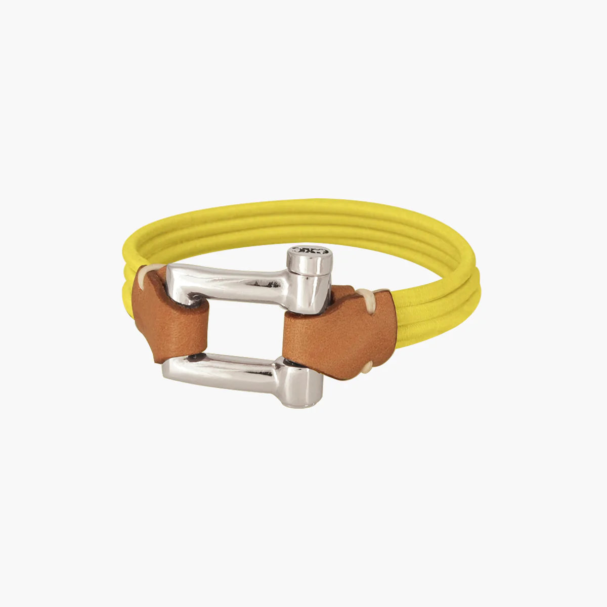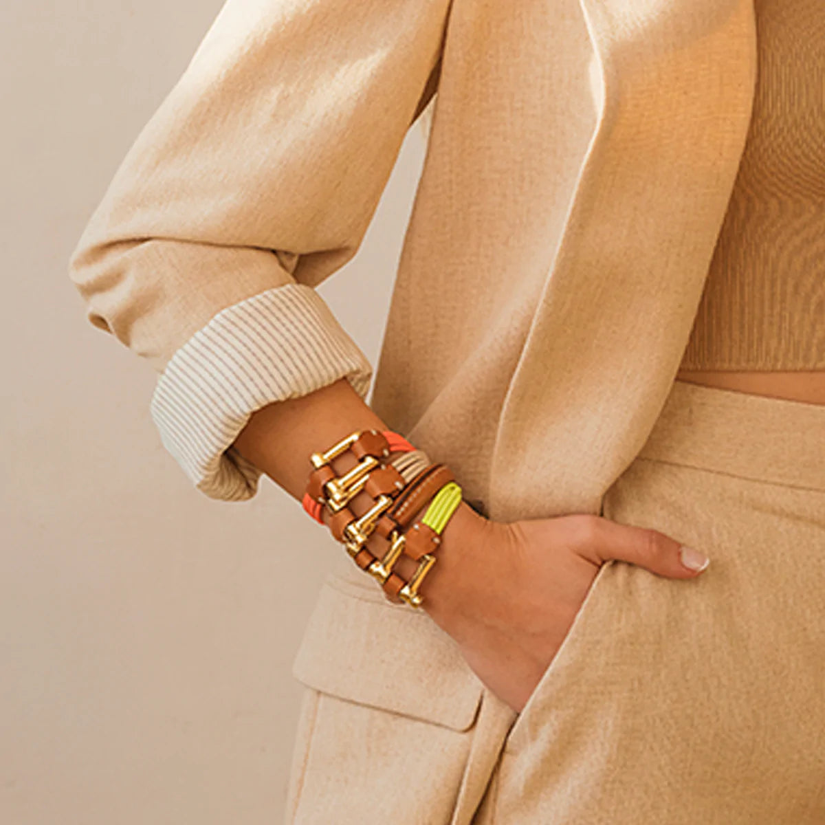 These CXC bracelets are the perfect everyday basic with a twist. Featuring 4 colorful elastic cords of 2.5 mm with a camel leather terminal, sewn with hand waxed thread and silver or gold plated closure.