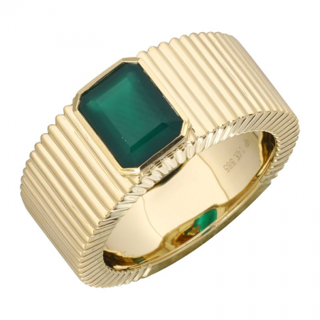 This exquisite ring is handcrafted from 14k yellow gold and fluted green agate, creating a timeless statement piece. The unique lines add elegance and sophistication for a luxurious and exquisite finish.